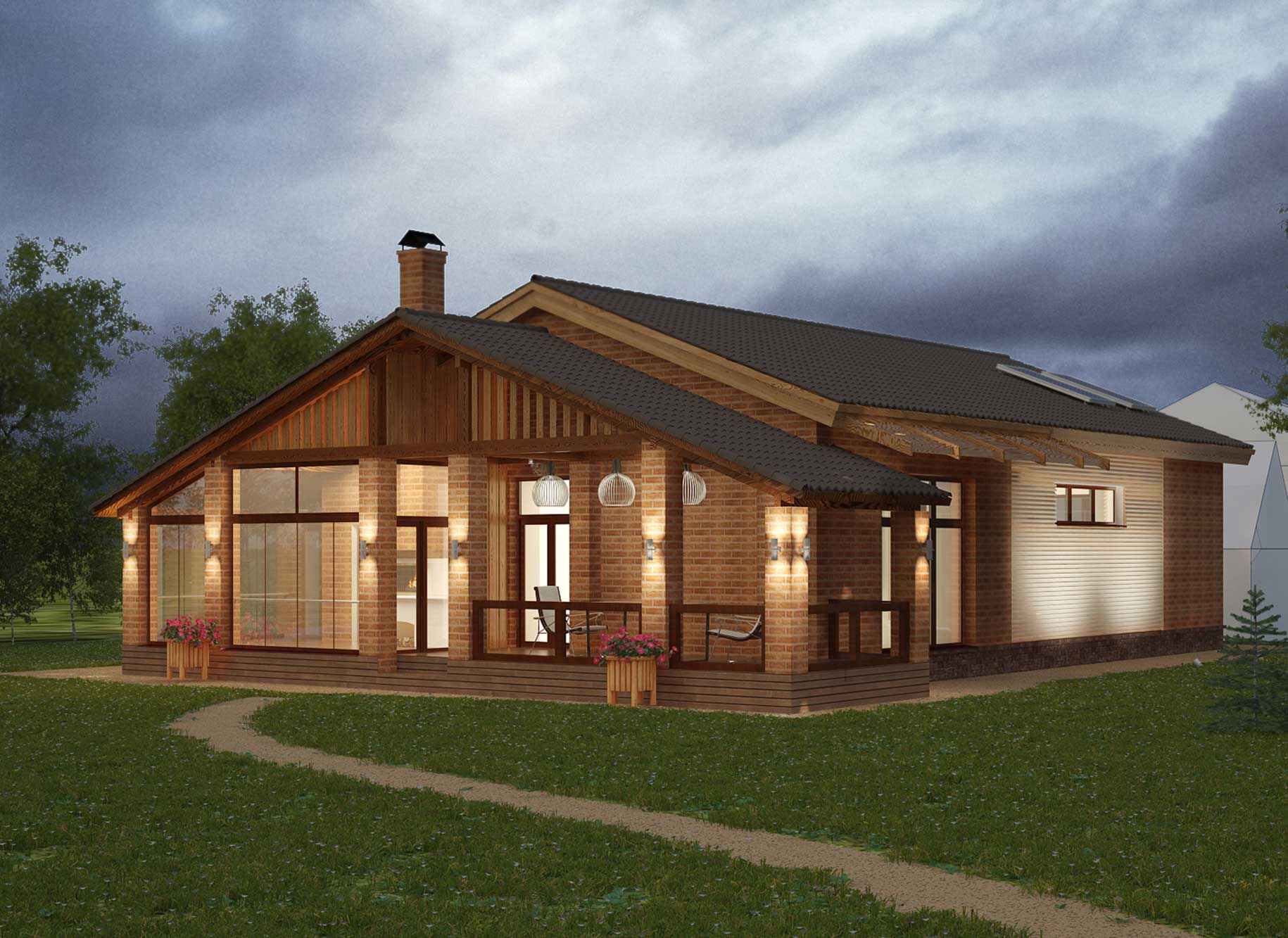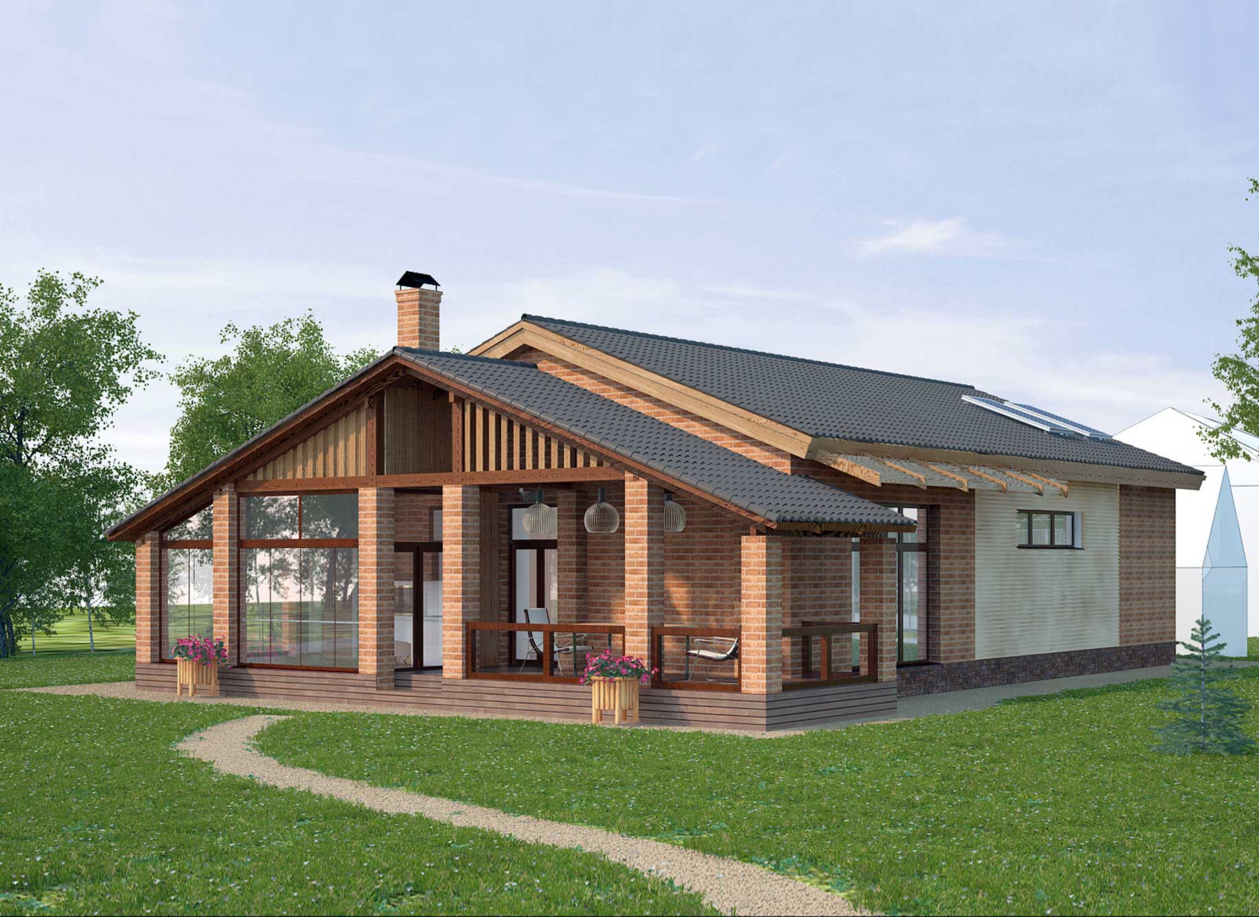 Exterior of the building in a contemporary style to the conditions of energy-efficient design. Big "panaramnoe" window lounges made to the southern facade of the device over it wooden "pergolas" performing solar control on hot summer days. In an unheated outdoor kitchen provides installation of frameless sliding glass, which if necessary can be protected from rain and wind.