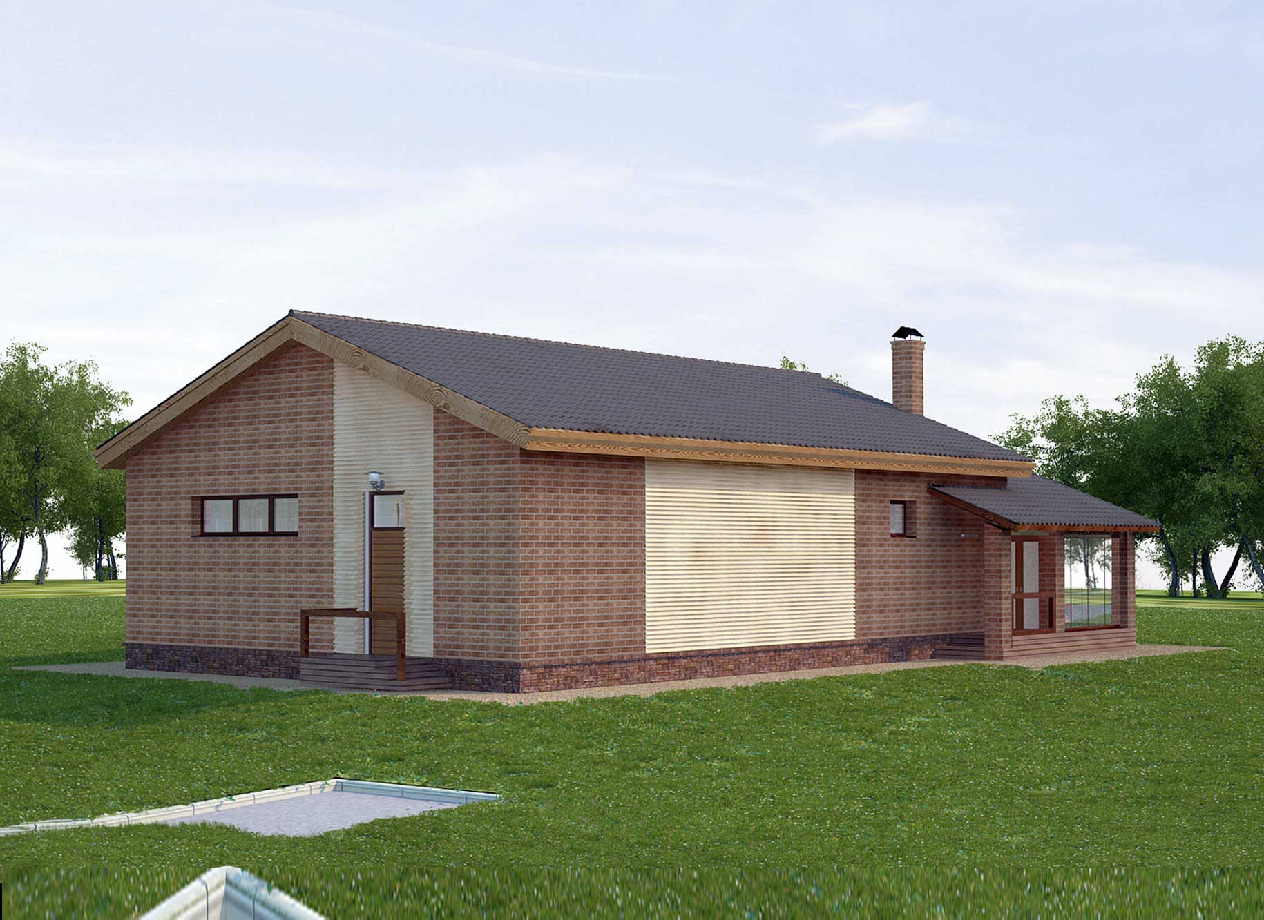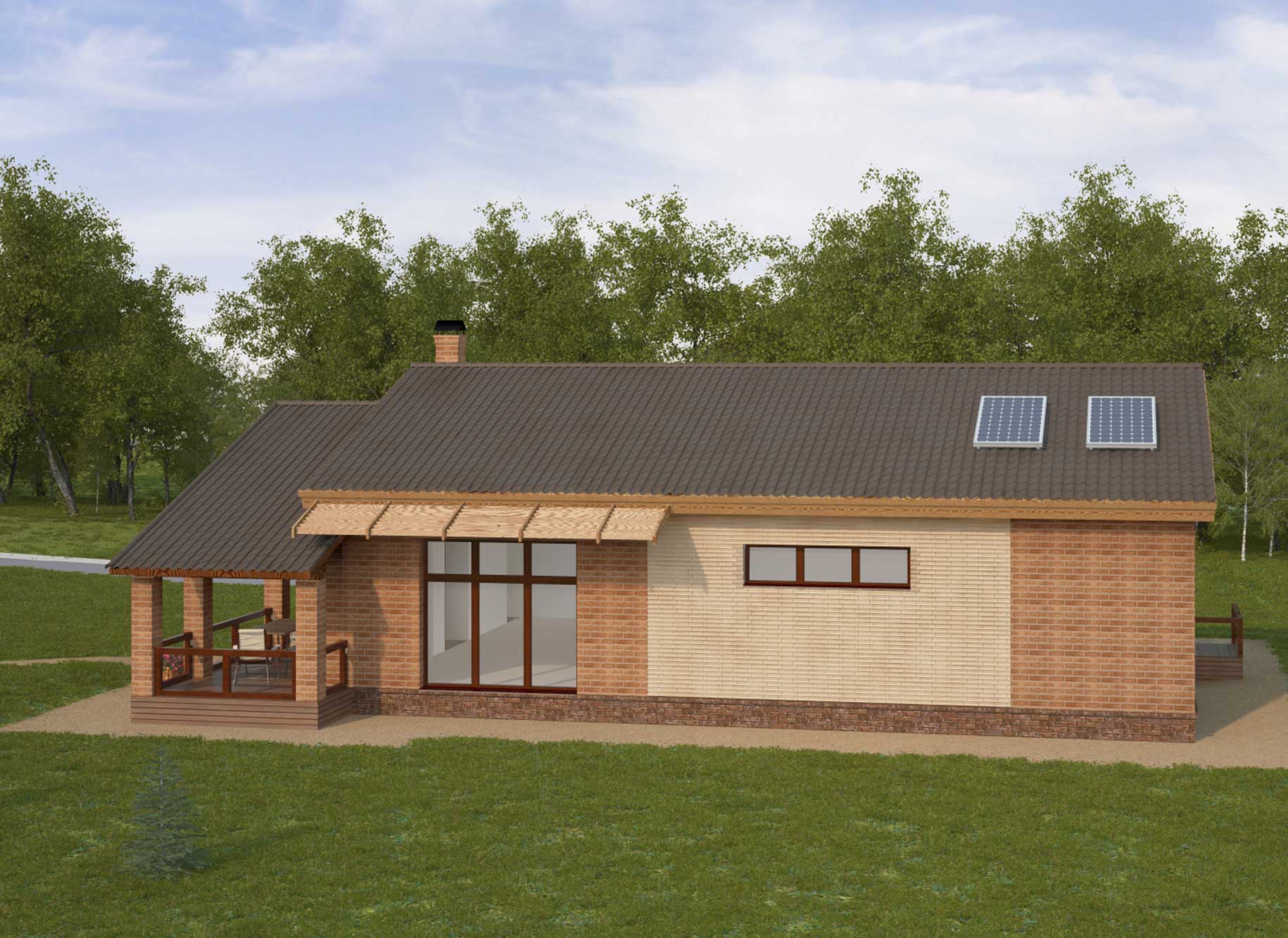 Spa complex is designed for detached, single-storey and is composed of two volumes. Mainly dominated by the volume available for room heating. This volume is made rectangular in plan, with a gable roof, which forms an unheated attic space. To the main volume for the organization unheated summer kitchen and outdoor terrace on the west added a extra, also with gable roof, but the lower height. In the summer kitchen will be installed at a barbecue stove and sink with water supply and sanitation.